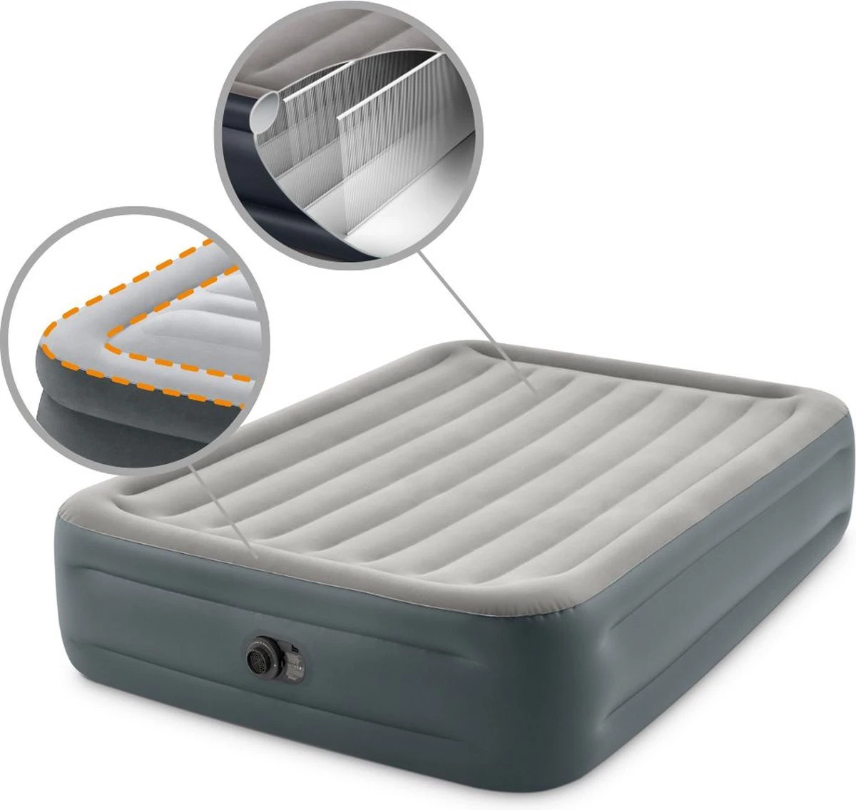 | Verpakkingsinhoud | Verpakkingsinhoud1xIntex Essential Rest – Luchtbed – 2-Persoons – 152x203x46 cm (BxLxH) – Grijs – Met ingebouwde motorpomp |