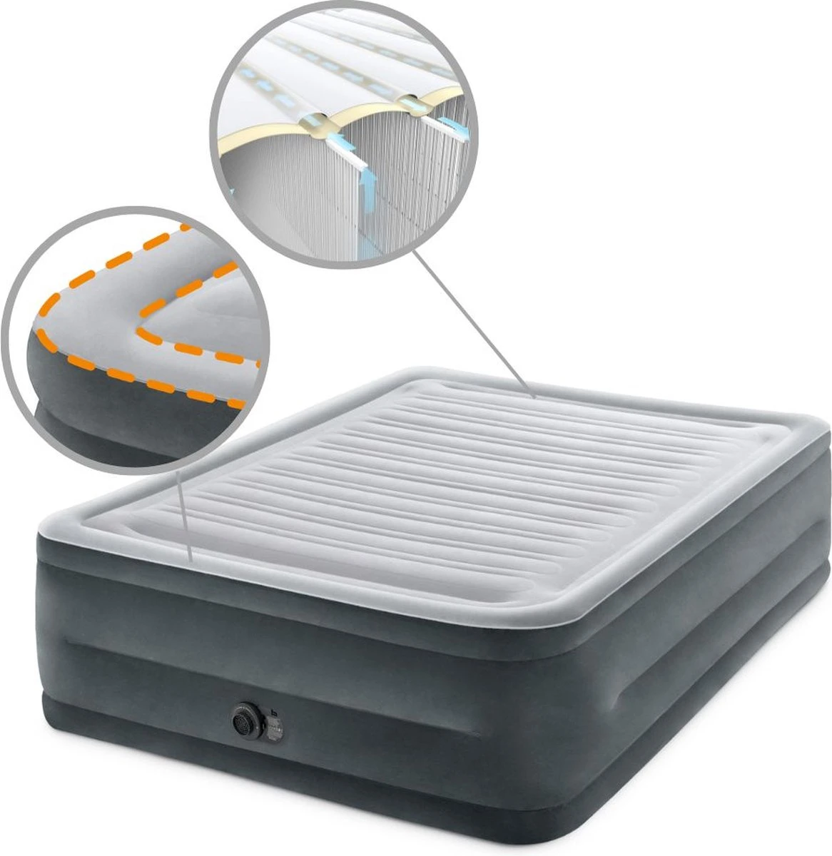 Het 2-persoons Intex Comfort-Plush High Rise ‘Queen’ luchtbed met afmeting 152x203x56 cm is geschikt voor thuisgebruik. Het luchtbed heeft een hoogte van 56 cm, waardoor in- en uitstappen extra gemakkelijk wordt. De binnenkant van het luchtbed bevat polyester draadjes die van de boven- naar de onderkant van het luchtbed lopen. Deze duizenden vezels zorgen voor perfecte stabiliteit en een uitstekende ondersteuning van het lichaam. Deze binnenstructuur met ondersteunde Dura-Beam vezels, ook wel de Fiber-Tech technologie genoemd, is een uniek kenmerk van deze Intex luchtbedden en een garantie voor een comfortabele slaapervaring. Dit unieke luchtbed beschikt naast het fiber-tech interieur ook over een unieke K-beam randondersteuningsconstructie wat ongeëvenaarde ondersteuning en comfort biedt. Daarbij bevat het luchtbed een Quickfill Plus interne pomp, waardoor u enkel de stekker in het stopcontact hoeft te steken en de knop naar ‘+’ hoeft te draaien om het luchtbed op te blazen. Om het luchtbed na het gebruik weer leeg te laten lopen, draait u de knop naar ‘-‘ en het luchtbed zal leeglopen. Het luchtbed beschikt over een zacht dubbellaagse comforttop wat zorgt voor een glad slaapoppervlak en zorgt voor een goede nachtrust. In tegenstelling tot de andere luchtbedden, beschikken de luchtbedden uit de Dura-Beam Deluxe serie over horizontale beams voor het ultieme comfort. Zo creëer je in enkele minuten een fijne slaapplek op de camping, op je logeeradres of voor gasten die blijven slapen.